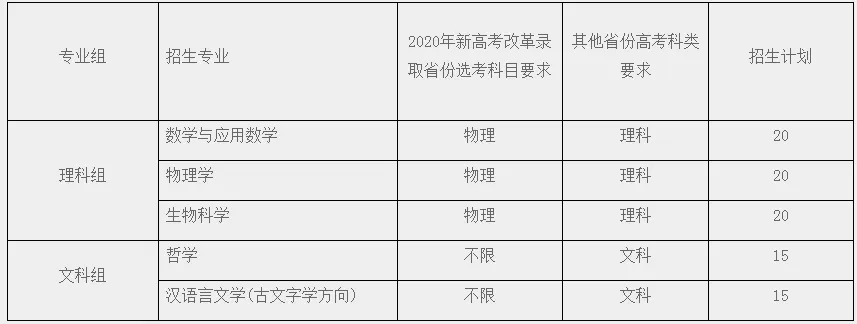 服务国家重大战略需求的基础理科学科以及国家人才紧缺的人文社会科学领域,招生专业、选考科目、科类要求及招生计划见下表: