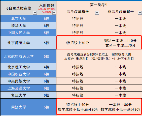 此外,开展强基计划招生的高校全部为“双一流高校”,这就要求考生的高考成绩要与这些高校的层次相匹配。以下是部分高校的入围规则,从高校对分数线的要求上不难看出入围难易。