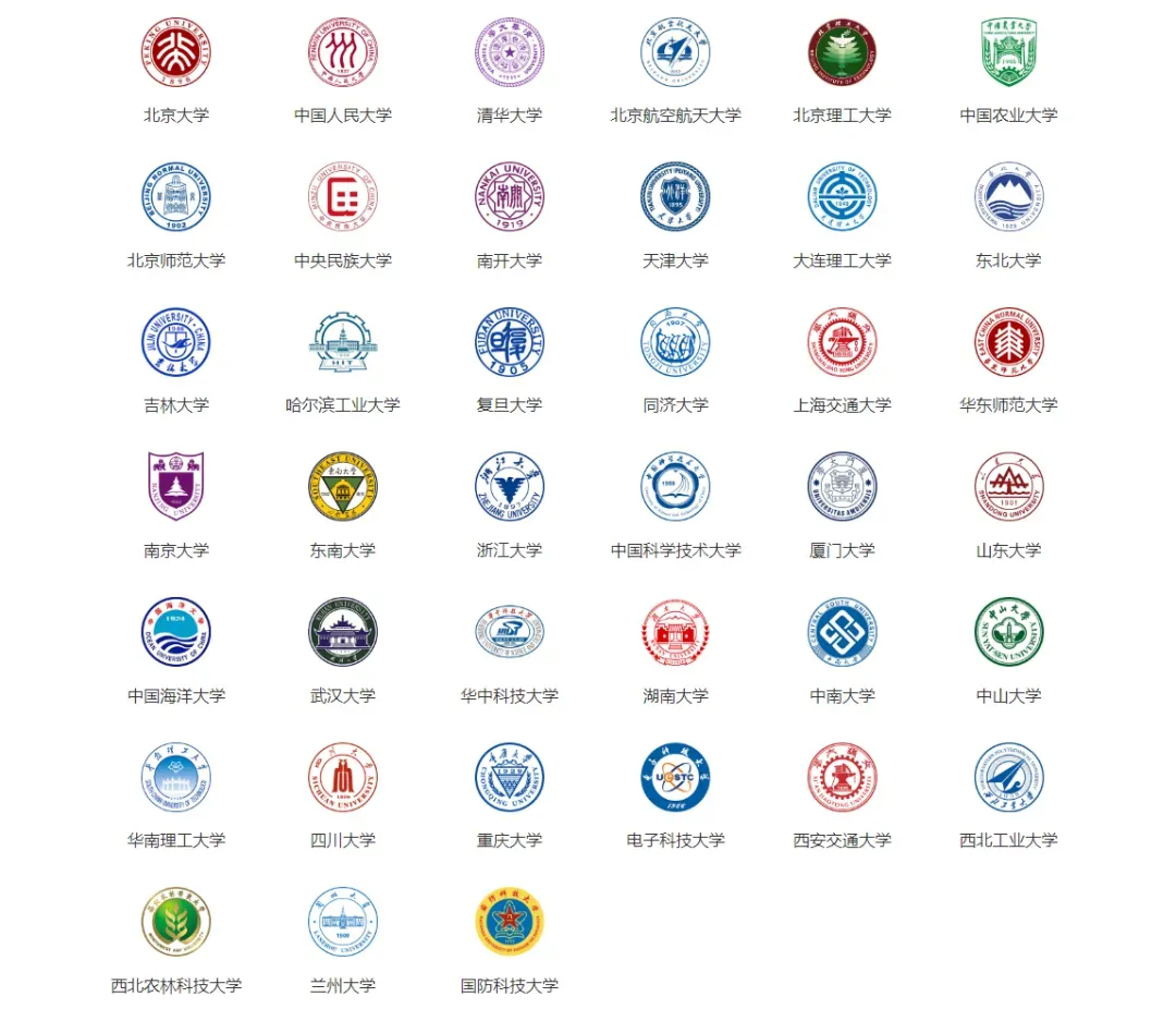 北京大学、清华大学、中国人民大学、北京航空航天大学、北京理工大学、中国农业大学、北京师范大学、中央民族大学、南开大学、天津大学、大连理工大学、吉林大学、哈尔滨工业大学、复旦大学、同济大学、上海交通大学、华东师范大学、南京大学、东南大学、浙江大学、中国科学技术大学、厦门大学、山东大学、中国海洋大学、武汉大学、华中科技大学、中南大学、中山大学、华南理工大学、四川大学、重庆大学、电子科技大学、西安交通大学、西北工业大学、兰州大学、国防科技大学、湖南大学、西北农林科技大学、东北大学,共39所985高校。
