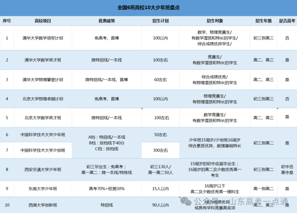 在这些项目中,最早初三起点可以报名。其中,清华数学领军计划、北大物理卓越计划、西交大少年班有机会免高考。接下来一起了解这些少年班吧。